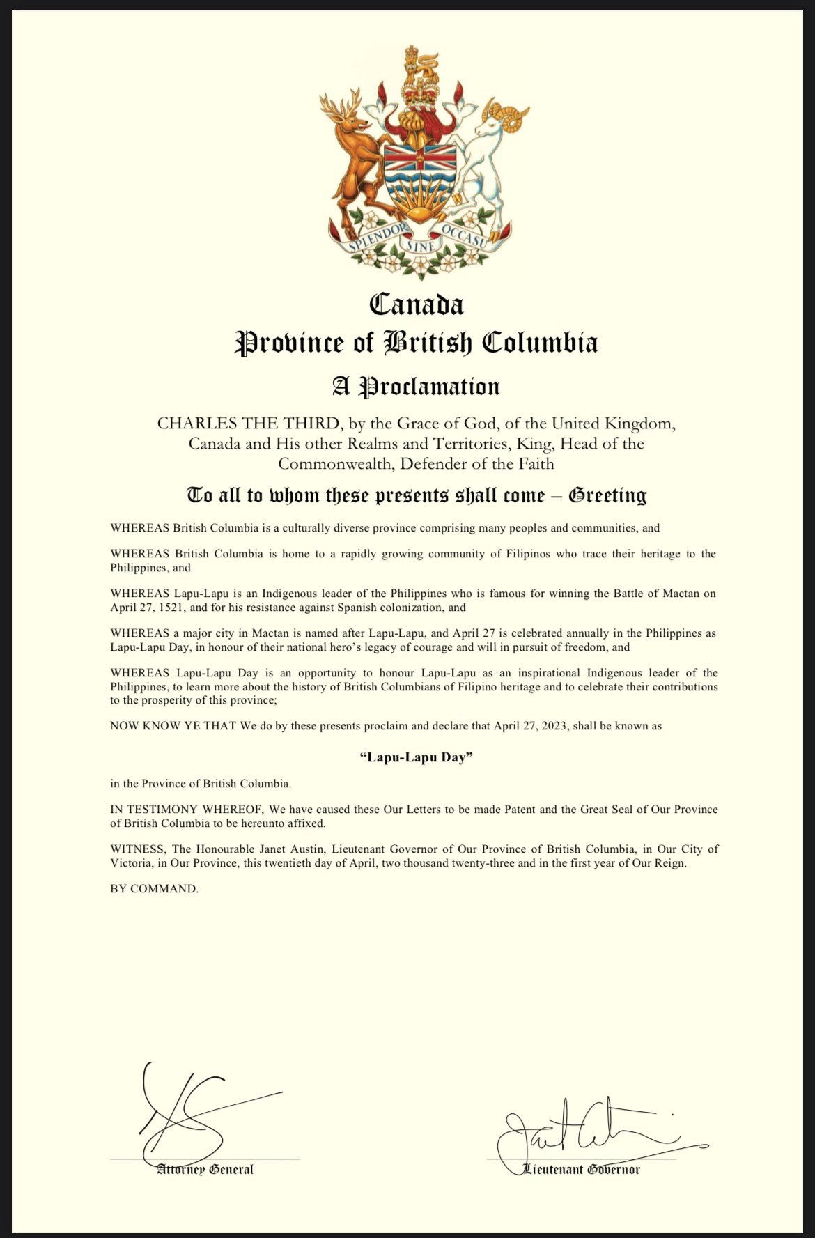 This declaration not only honours the heroic legacy of Datu Lapu-Lapu but also symbolizes the cultural harmony and mutual respect that thrive in the province of British Columbia. It serves as a powerful reminder that the lessons of history can bridge gaps, inspire unity, and strengthen the bonds of communities, celebrating the rich tapestry of cultures that make up the beautiful mosaic of British Columbia and the Philippines alike.